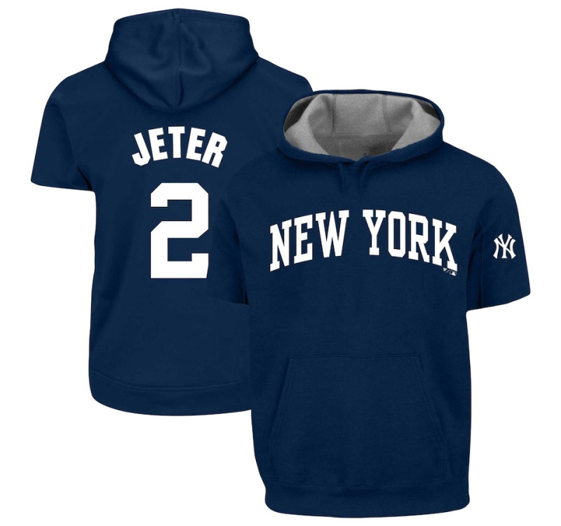 Highlight a true New York Yankees icon in style this season with this Derek Jeter short sleeve hoodie from Profile. The instantly recognizable New York Yankees graphics printed across the chest will ensure your die-hard loyalty will never falter. The short sleeve construction provides a unique twist when it comes to your outerwear while the fleece lining ensures comfort and softness with every wear.