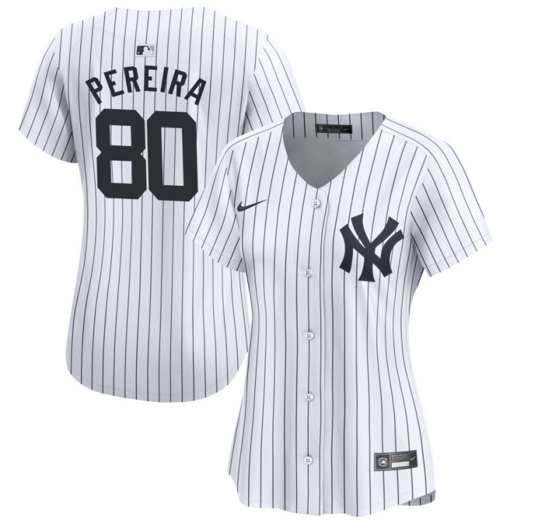 Celebrate the pinstripe legacy with this iconic Everson Pereira #80 New York Yankees Home Women's Jersey - White Limited. The crisp white fabric adorned with classic navy pinstripes perfectly captures the timeless elegance of Yankees tradition. Featuring the legendary interlocking NY logo prominently displayed across the chest, this jersey transforms you into a walking tribute to baseball's most storied franchise. Whether you're cheering in the Bronx bleachers or watching from home, the moisture-wicking fabric keeps you comfortable while the bold team graphics declare your undying loyalty to the 27-time World Champions. This isn't just apparel - it's a badge of honor for true Yankees faithful.
