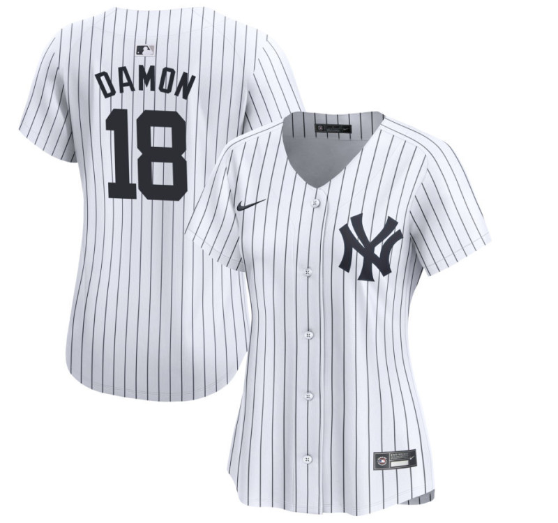Celebrate the pinstripe legacy with this iconic Johnny Damon #18 New York Yankees Home Retired Player Women's Jersey - White Limited. The crisp white fabric adorned with classic navy pinstripes perfectly captures the timeless elegance of Yankees tradition. Featuring the legendary interlocking NY logo prominently displayed across the chest, this jersey transforms you into a walking tribute to baseball's most storied franchise. Whether you're cheering in the Bronx bleachers or watching from home, the moisture-wicking fabric keeps you comfortable while the bold team graphics declare your undying loyalty to the 27-time World Champions. This isn't just apparel - it's a badge of honor for true Yankees faithful.
