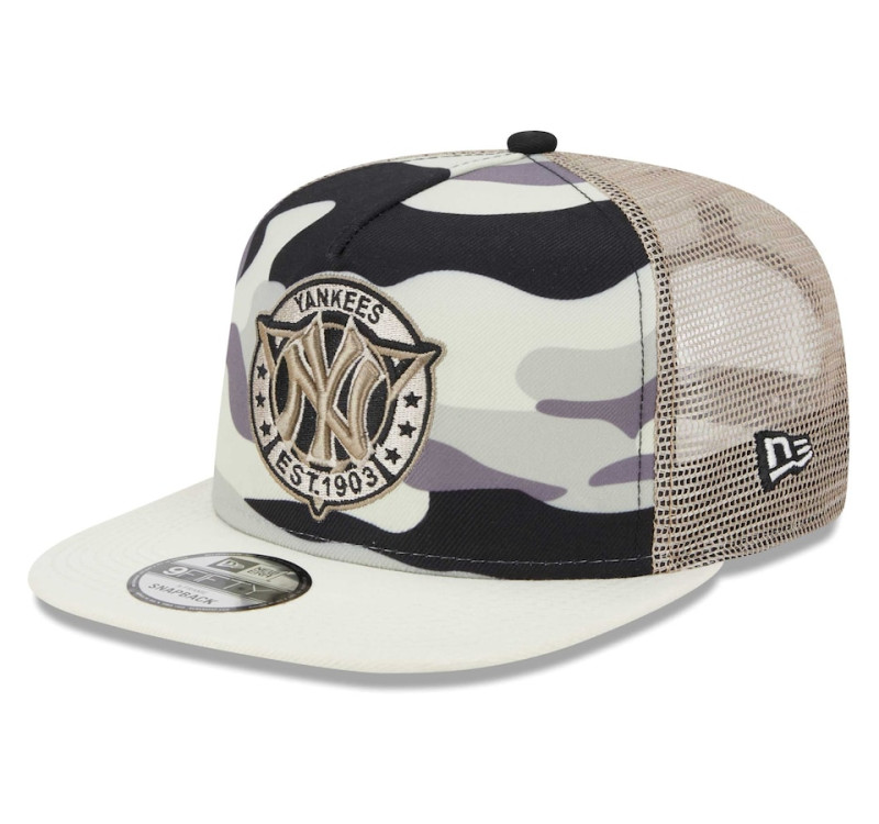 Continue highlighting your love for your favorite team with this New York Yankees Chrome A-Frame 9FIFTY trucker snapback hat from New Era. With the New York Yankees graphics boldly embroidered on the crown and trendy camo pattern, you can guarantee that your loyalty is always at the forefront. The breezy back mesh panels promote freshness while the snapback closure ensures the perfect fit.